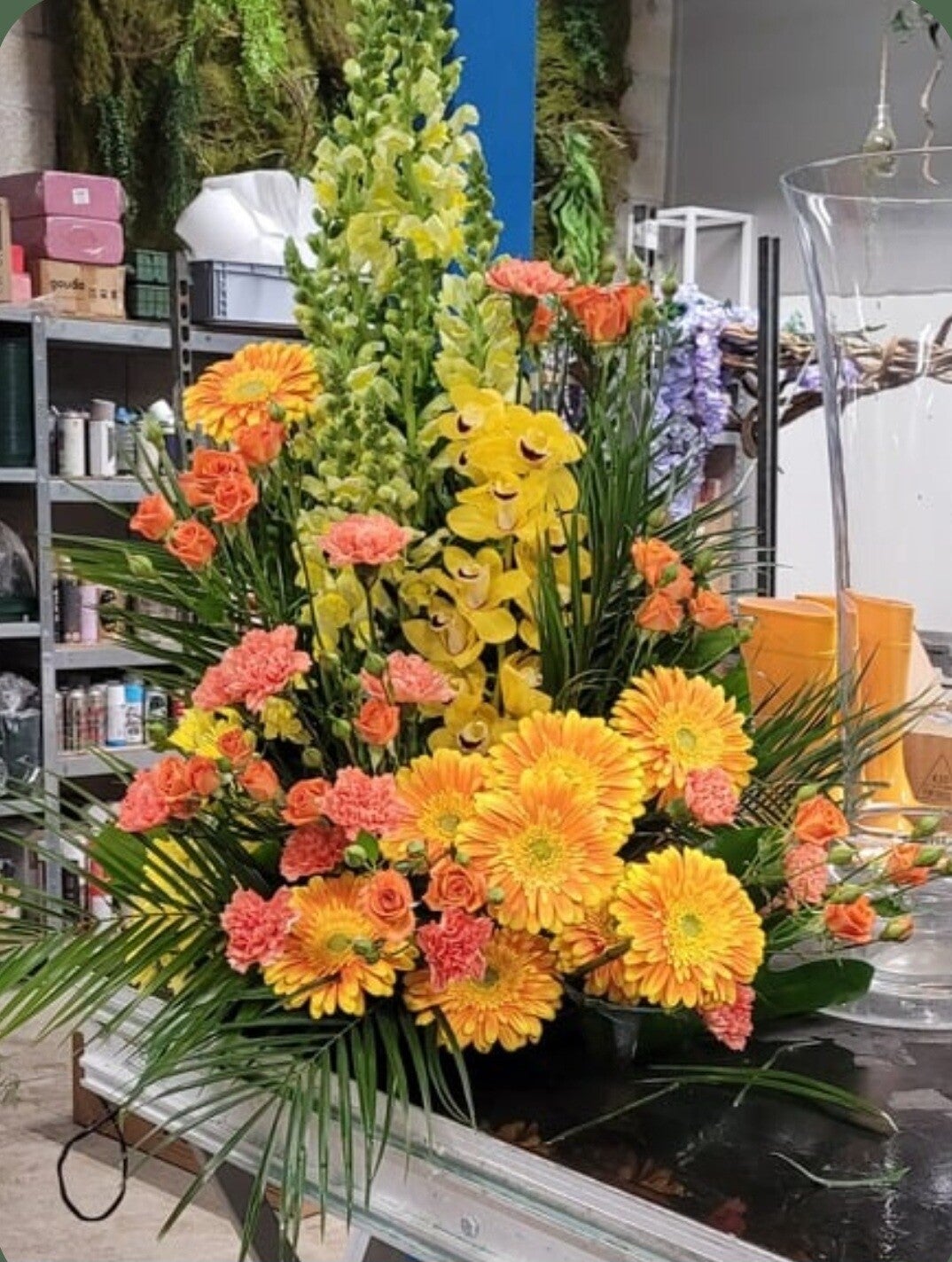 Une composition généreuse, d’environ 1,20 mètre, pensée pour exprimer un profond attachement et fleurir dignement le lieu de repos.